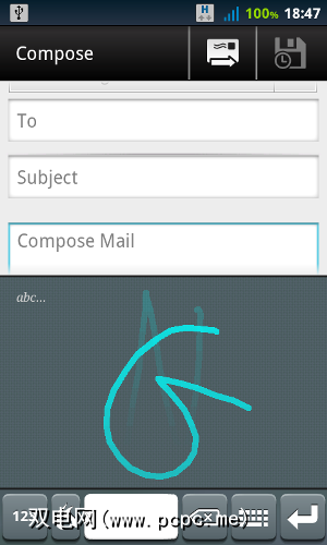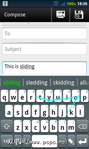 我喜欢这种字体设计和一般外观, -该键盘的感觉。查看顶部的建议条效果如何;非常优雅。滑动效果很好,可与SlideIT相提并论(虽然更好)。除了“点击"(哇,我可以点击!)以外,还有一种输入模式,主要针对那些真的很想念旧Palm Pilot的人:
