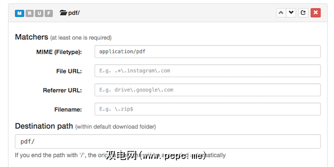 Chrome扩展程序RegExp Download Organizer允许您创建规则下载的文件类型。例如,每次下载PDF时,它将自动保存到downloads文件夹中的所选文件夹中。