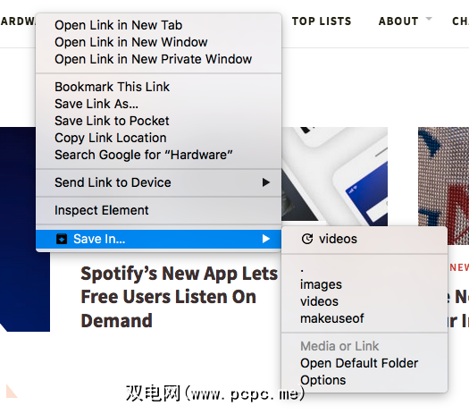 如果您确定“保存位置"适合您,则在安装扩展后,右键单击a链接或浏览器中的文件,您现在会在上下文菜单中看到另存为,其中已经列出了两个文件夹选项:图像和视频。如果将文件保存到这些位置,则浏览器会自动在“下载"文件夹中创建这些子文件夹(如果不存在)。