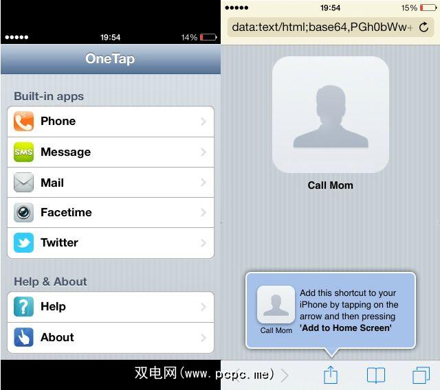 打开OneTap,您可以选择是否要通话,发短信,发邮件,FaceTime或Tweet给您的联系人。该应用程序使用Safari将联系人固定到主屏幕。对于每个联系人,它都会生成一个在Safari中打开的长URL。只需点击共享图标并点击添加到主屏幕即可创建快速拨号图标。即使没有互联网连接也可以使用。