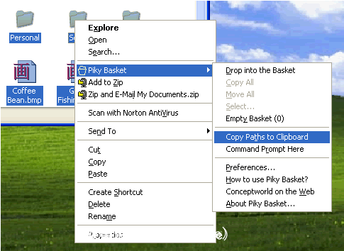 现在,让我们以上面的情形为例,以Piky的方式进行操作。您将快速浏览五十个文件夹,右键单击要复制的文件,然后将它们“放入购物篮"。查看屏幕快照,您会看到“空篮子(0)"。好了,当您开始将文件放到购物篮中时,这将开始累加,因此您可以随时查看“购物篮"中有多少文件,以便保持计数。