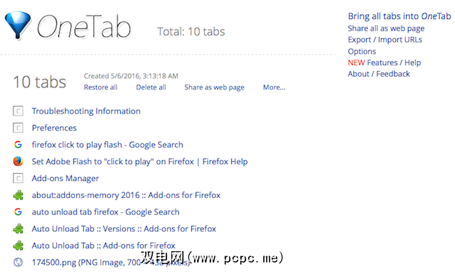 在所有主流浏览器上均可使用,OneTab是一种管理选项卡而又不会丢失的绝佳方法之一。只需单击一次OneTab图标,它将关闭所有打开的选项卡并生成它们作为列表。您可以再次单击以重新打开所有选项卡,或保存列表以便以后打开。
