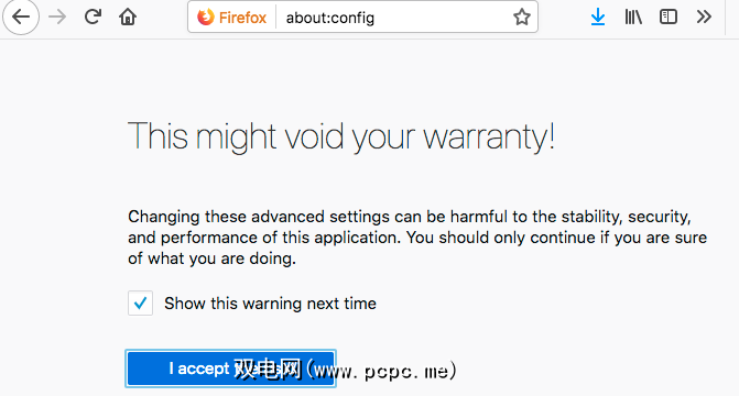您可以通过可访问的“配置"菜单更改Firefox中的复杂设置。我们已经对Firefox进行了一些必要的调整,但是这次,我们将只专注于使浏览器运行更快的内容。
