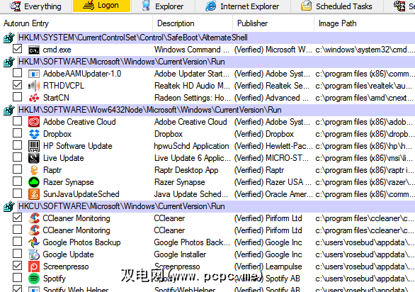 大多数用户在这两个程序处停止其启动配置。但是,有些工具会显示其他启动程序。微软的 Autoruns 程序(是其Sysinternals官方工具包的一部分)就是这样做的。自动运行的登录标签显示的启动程序是CCleaner的启动功能的两倍。要在“自动运行"中禁用启动程序,请取消选中它。就是这么简单,控制启动程序无疑会加快计算机的速度。