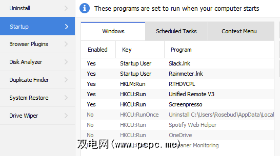 启动程序的经验法则很简单。如果每天都不使用该程序,请将其禁用。如果该程序不适用于键盘或打印机等硬件组件,请禁用它。像 CCleaner 这样的第三方软件还具有启动配置选项。打开CCleaner,然后转到工具>启动。此功能还允许您启用或禁用各种启动程序。
