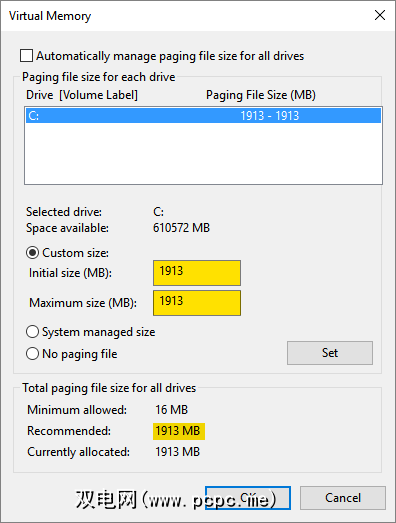 切换到高级标签。在调整最佳性能下,选择程序。之后,点击虚拟内存下的更改... 。在“虚拟内存"窗口中,取消选中自动管理所有驱动程序的页面文件大小。选择自定义尺寸,然后在初始和最大尺寸条目中输入推荐编号。