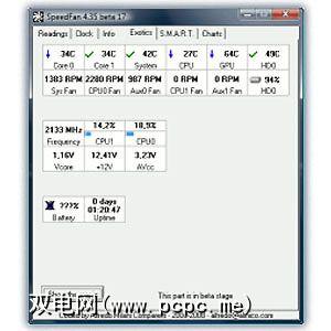 此完全反传统的屏幕上载有一些有用的数据,格式为令人兴奋的矩形。它以与在贴有标签的“读数"选项卡上看到的相同温度读数开始,但继续显示硬盘SMART额定值(HD0和HD1),以及每个CPU内核的利用率,CPU的主时钟频率,以及系统的正常运行时间。