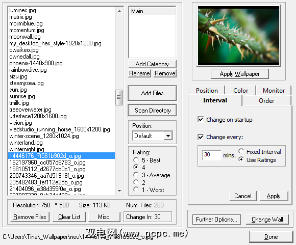 如果您正在寻找管理墙纸的高级工具,那么墙纸大师可能就是它。除了能够添加整个目录外,您还可以为每个墙纸设置不同的位置,为每个墙纸设置自定义背景色,为墙纸评分,并设置间隔以及显示墙纸的顺序。 Wallpaper Master可让您完全控制桌面背景图像的变化。
