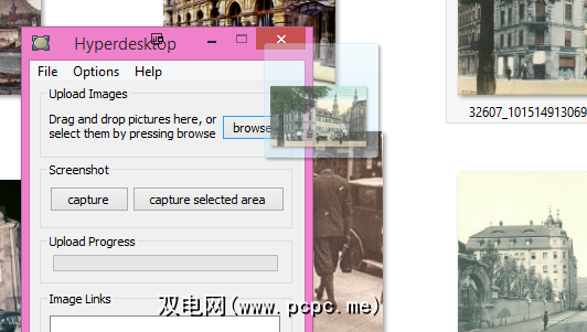 您可以将图像拖到Hyperdesktop窗口中,单击“浏览"按钮以在您的计算机上找到图像,或使用提供的按钮捕获屏幕截图。不管您执行什么操作,图像都将在几秒钟内立即上传到Imgur,并将Imgur直接链接复制到提供的“ Image Links"框中。还会在新的标签/窗口中打开该链接。