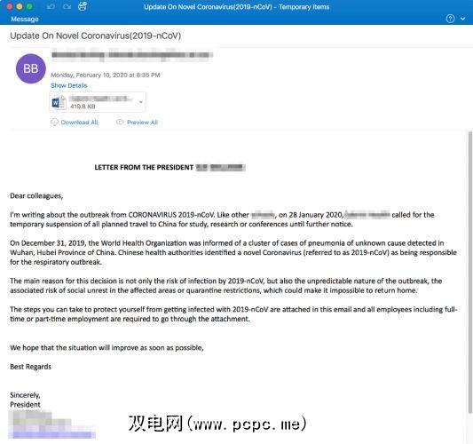 在内容方面,电子邮件主题可能包含类似于“ Coronavirus 2020-安全提示"或“ [卫生组织]的SARS-CoV-2 2020安全建议"的内容。该电子邮件将包含一个附件,该附件旨在列出新的惊人的冠状病毒安全措施。实际上,这是一个网络钓鱼文档,将安装恶意软件。