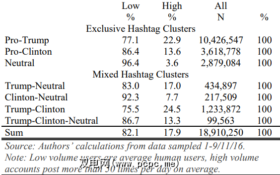 该研究确实指出,某些人类用户不可避免地被卷入了高度自动化的范围。它还指出,展现出高度自动化的帐户也很少使用混合标签集群括号中的术语(由于转发量巨大,因此禁止使用Trump-Clinton组合)。
