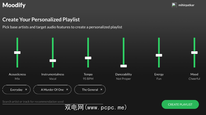 因此,这里有不同的可调节音乐功能或取得Moodify来创建播放列表的参数: