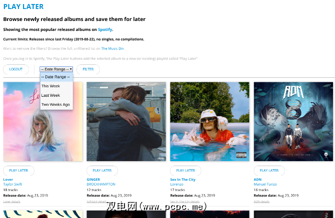 每个星期五,Play-Later都会列出上周发行的专辑,并按受欢迎程度对其进行排名。您将获得封面插图,艺术家和专辑名称,以及其中的曲目数量。如果您感兴趣,请单击“稍后播放"。专辑会自动添加到Spotify中名为“稍后播放"的播放列表中。