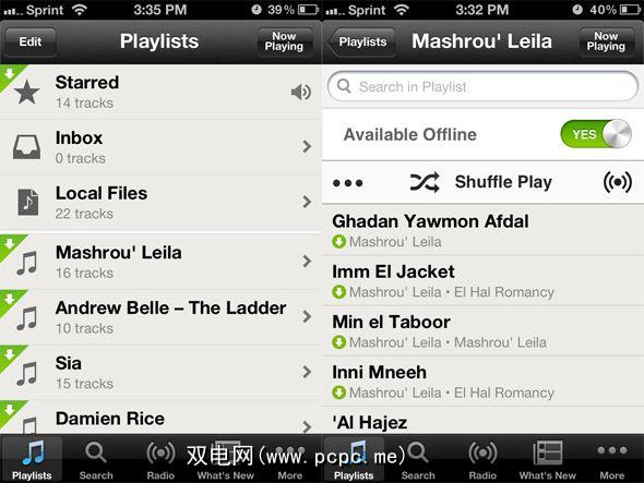 Spotify for iOS应用的第一个标签是播放列表标签。它包括您创建的播放列表,已加星标的曲目,在Spotify(收件箱)上发送的歌曲以及在iOS设备上保存的所有音乐文件。任何带有绿色箭头的曲目或播放列表都意味着它可以在离线模式下使用。