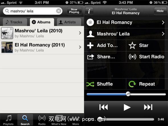 创建新的播放列表后,下一步就是找到歌曲添加到它。您可以按曲目,专辑和歌手搜索音乐。对于单独的曲目,您必须首先开始播放它们才能将它们添加到现有或新的播放列表中。点击屏幕一次以显示菜单,然后按“添加到..."按钮,您可以将其添加到现有或新的播放列表中。在此菜单中,您还可以为歌曲加注星标,基于该曲目开始广播,在社交网络上分享歌曲,切换随机播放以及重复打开和关闭以及调整音量。
