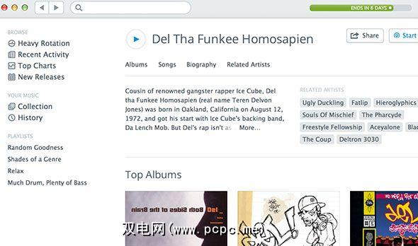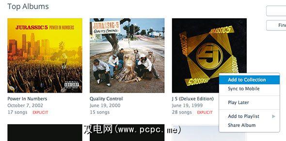 在任一服务上管理音乐的方式再次不同。我从小就听专辑,而不是播放列表。即使我上学的时候都在讨论iPod和交换MP3,但专辑却是我一直听音乐的方式。因此,我真的很想念Spotify的音乐“收藏",而不得不把所有东西都塞进播放列表中。这样一来,播放列表的尾部就会无休止地拖到屏幕的下方,其中的大多数我将永远不会真正播放,而只是为了保存专辑而创建。 Rdio为我解决了这个问题,让我可以将音乐添加到与播放列表分开的收藏中。