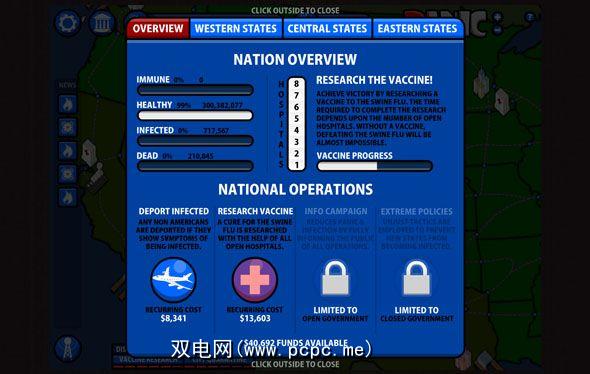 胜利是通过研究和接种总人口的70%或根除疾病的所有痕迹来实现的。如果恐慌率达到100%或超过50%的美国人口死亡,您将输掉这场比赛。简单,但确实相当艰辛-原始开发人员对游戏的看法令人耳目一新。