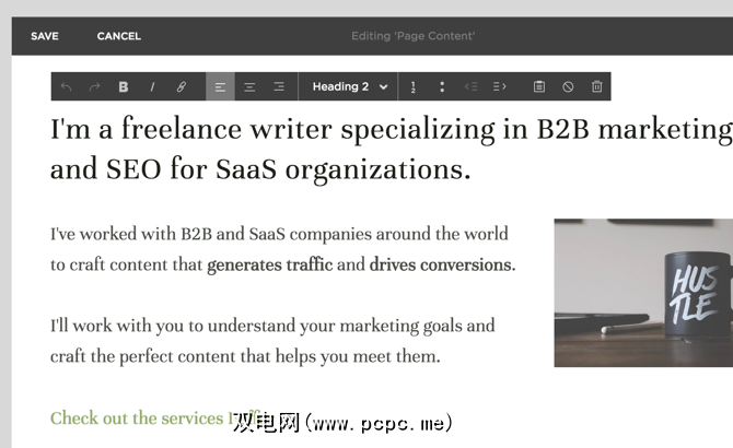 Squarespace可以让您浏览其主题(选择地较小)的主题,然后单击一下即可切换到新主题,并且每个主题是开箱即用的美丽。他们的格式化工具也易于使用,并且编辑界面再简单不过了。单击您要编辑的项目,键入,然后单击“保存"。就是这样。
