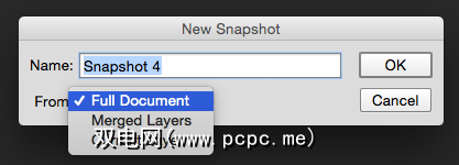 这将打开一个对话框,您可以在其中选择快照名称(Photoshop默认为“快照" 1,快照2等),然后决定要保存所有图层(完整文档),合并图层还是仅保存当前所在的图层。