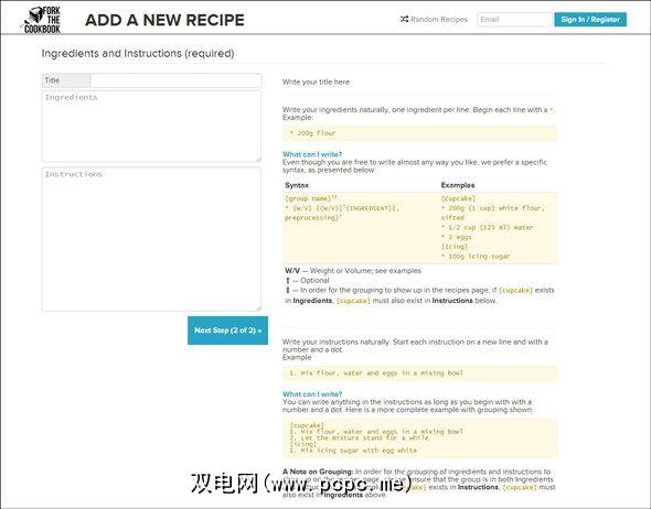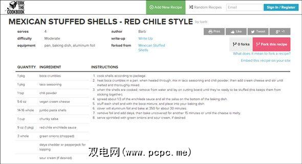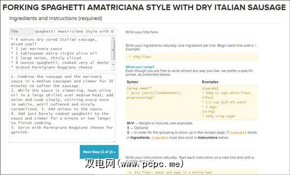 食谱中有趣的部分是怎么做的。分叉是网站的核心,因此,如果您有一些额外的配料要添加到原始配方中,请单击粉红色按钮。如下面的屏幕截图所示,在开始添加自己的食材并根据自己的口味修改菜式时,“叉状菜谱"会要求您遵循简单的语法。哦,您也可以自己命名。