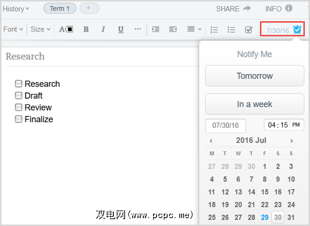 Evernote具有提醒。您可以向任何便笺,待办事项列表,照片或您保存的其他项目添加提醒。该应用程序允许您选择日期和时间,并在该时间到来时通知您。
