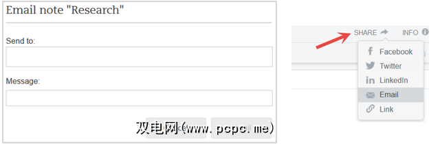 要共享单个便笺,请打开便笺并选择箭头或 Share 图标(在任何平台上的注释导航中)。然后,输入收件人的电子邮件地址和可选消息。如果您更喜欢使用链接共享项目,那么这也是您在网络和桌面应用程序上的共享选项。