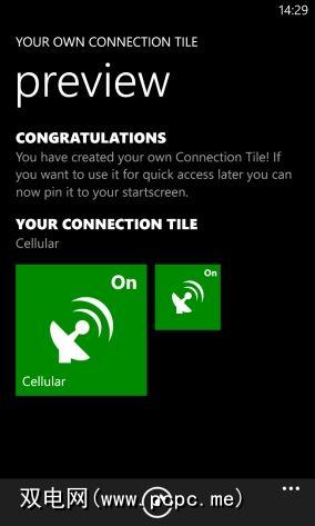 在研究了Windows Phone Store中的选项之后,我选择了Connection Tiles,这是一个免费的应用程序,的想法)可以让我轻松地切换移动互联网(设置互联网共享所需)。遗憾的是,Connection Tiles与Windows Phone 7.5和Windows Phone 8兼容。