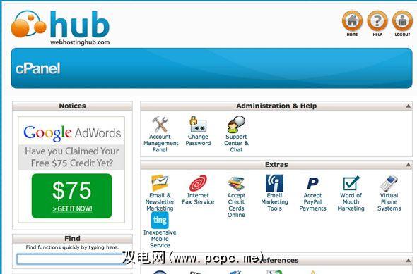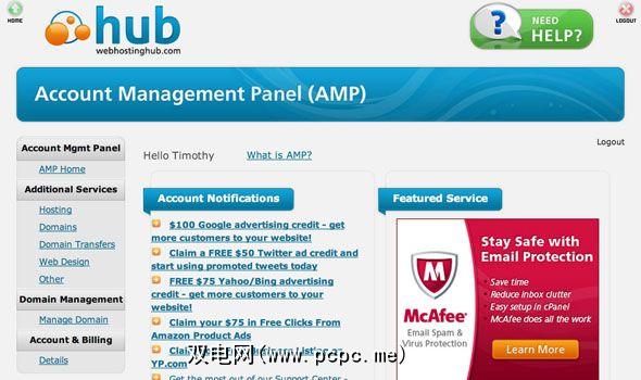 设置密码并登录后,向我介绍了帐户管理面板(AMP) ),这是事情的商业目的。该区域使您可以快速访问站点的控制面板,域管理以及帐户和帐单信息。如您所愿,看到Web Hosting Hub还会为您带来一些免费赠品,其中包括一些用于在Google,Twitter,Yahoo等网站上投放广告的优惠券。