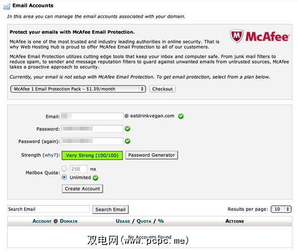 除了WordPress之外,我还希望为我的域提供一个快速的电子邮件帐户。所以我去了Cpanel,然后是Email Accounts区域。该屏幕为您提供了升级到McAfee Email Protection的选项,但是作为注重安全性的Mac用户,我对此并不在意。您可以指定电子邮件配额或不对其进行计量,并且有一个密码强度表以及我使用的安全密码生成器。