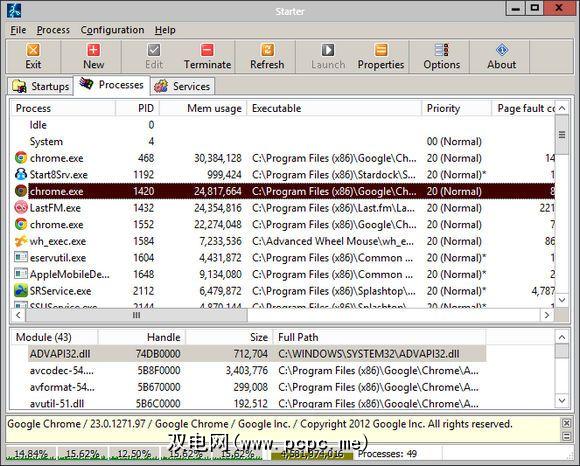 此选项卡还提供了双窗格视图,但垂直放置(而不是水平放置)。上半部分将显示您的过程,下半部分将显示与这些过程相关的模块(应仅对经验丰富的用户才重要)。