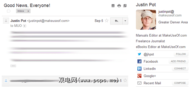 我们已经介绍了以下功能以前比较适合,但是此插件的功能非常有效,值得再次提及。简而言之,Rapportive通过从社交媒体帐户中提取数据来帮助您了解电子邮件联系人。