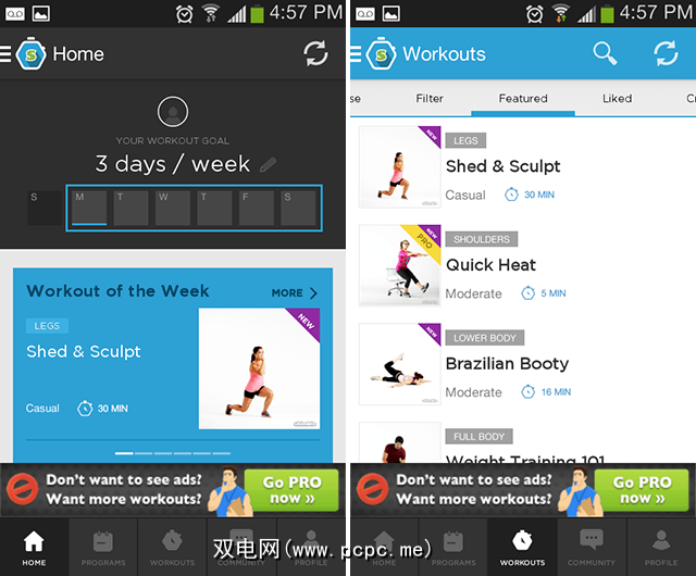 您需要创建一个免费帐户才能使用此应用。不幸的是,界面有点混乱。免费版由广告驱动,可以通过升级到高级版(每月$ 6.99 USD)将其删除(是的,这是一个订阅)。高级版包括特殊程序,“每周锻炼"挑战,自定义锻炼等。