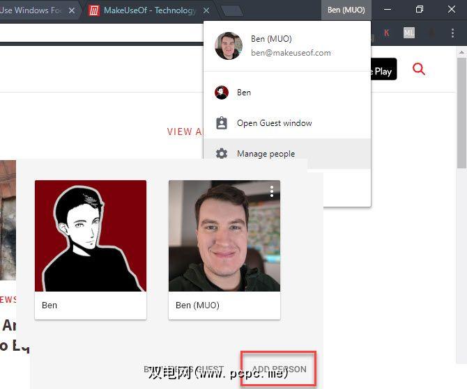 要创建新的Chrome个人资料,请点击浏览器右上角的人形。 (如果您已经在使用Chrome个人资料,则会显示您的姓名。)点击管理人员>新增人以设置新的个人资料。