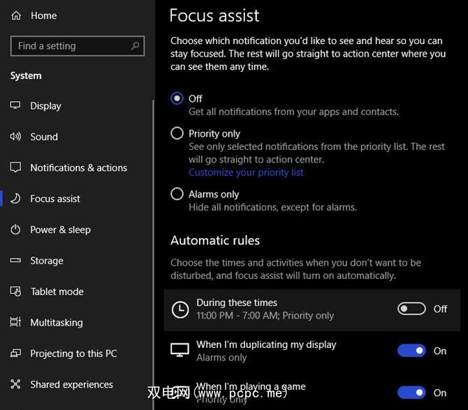 要使用它,请访问设置>系统>焦点辅助。在这里,您可以在三种状态之间进行切换:关闭,仅优先级和仅警报。点击自定义优先级列表以调整该级别。