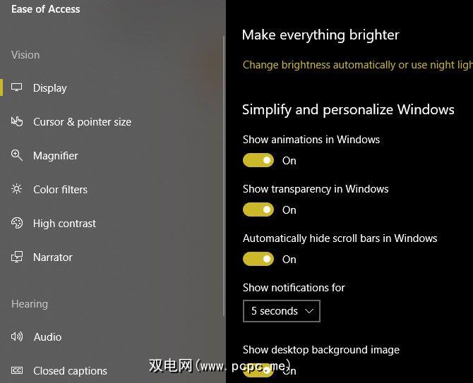 您会在设置>轻松访问>显示中找到一些要禁用的选项。在简化和个性化Windows 下,您可以禁用动画,透明度和自动隐藏滚动条。