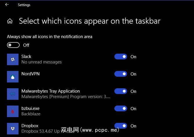 最后,您可以整理出现在系统任务栏(任务栏最右侧的区域)中的图标。访问设置>个性化>任务栏,然后点击选择在任务栏上显示哪些图标。这使您可以选择始终显示的图标。禁用图标以将其放入溢出菜单。