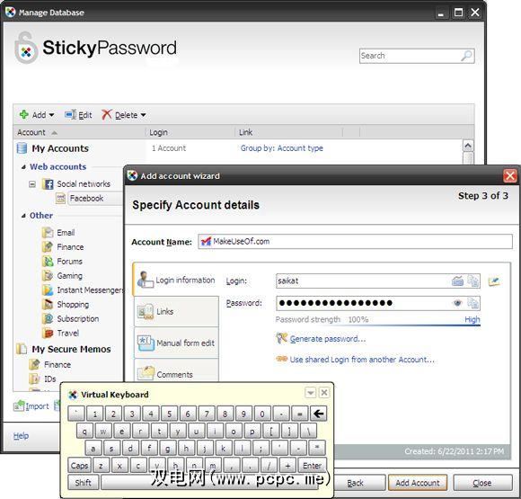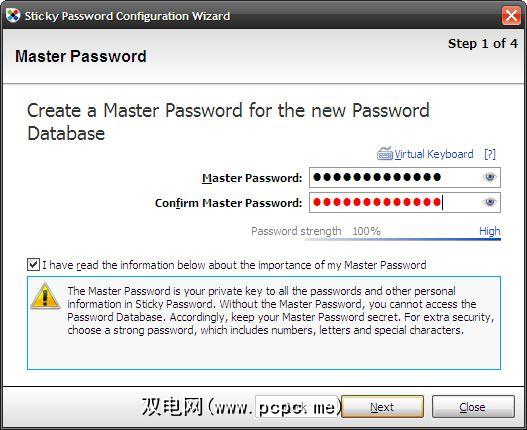 Sticky Password Pro是7.8 MB的下载。从安装主密码开始,安装过程将引导您完成四个步骤。这是您唯一需要记住的密码。 虚拟键盘还允许输入密码而无需按键盘上的键。接下来的三个步骤要求您设置授权方法(如何解锁和访问数据库); 锁定超时(闲置x分钟后自动锁定);并选择要安装的浏览器扩展。