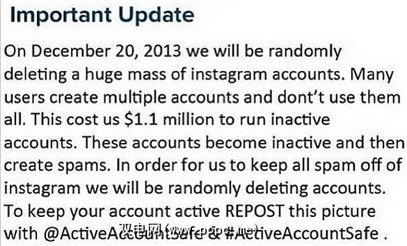 2013年底,一条消息开始在Instagram上流传:该服务将在12月20日大规模删除不活动和垃圾邮件帐户为了保护您的帐户,您所要做的就是重新发布警告,提及 @ActiveAccountSafe ,并使用标签 #ActiveAccountSafe 。