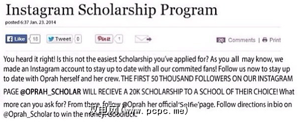2014年1月,出现了一个模仿奥普拉·温弗瑞的帐户在Instagram上的 @OPRAH_SCHOLAR 句柄下。承诺是简单而诱人的:使用该帐户的前50,000名用户每人将获得任何大学的20,000美元奖学金。大约有10万名追随者,该帐户不见了。