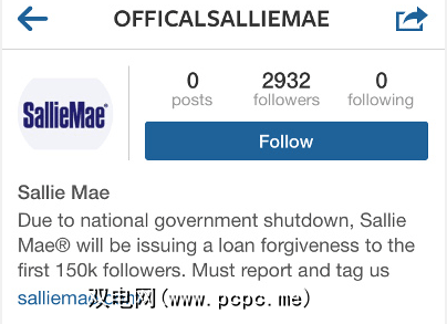 早在2013年10月,就在美国政府关闭后,大量冒充Sallie Mae的帐户开始了在Instagram上流行: @theofficialsalliemae _ , @officialsalliemaefund 和 @officialsalliemaeig 只是其中的一些。利用这些政治局势,这些帐户向所有跟踪,重新张贴和标记所述帐户的人承诺了学生贷款的宽恕。