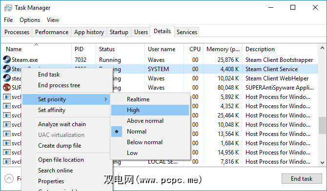 下一步,从详细信息面板中,< strong>在 SteamService.exe 上单击,然后选择设置优先级,然后选择高。