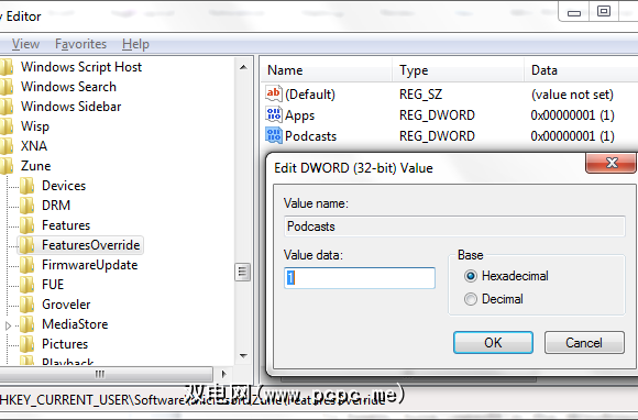 由于本地化问题,某些国家(例如英国和澳大利亚)将无法在Zune中找到Podcast视图。幸运的是,可以使用注册表编辑器(例如本机Windows注册表编辑器)来解决此问题。