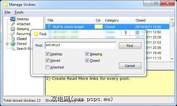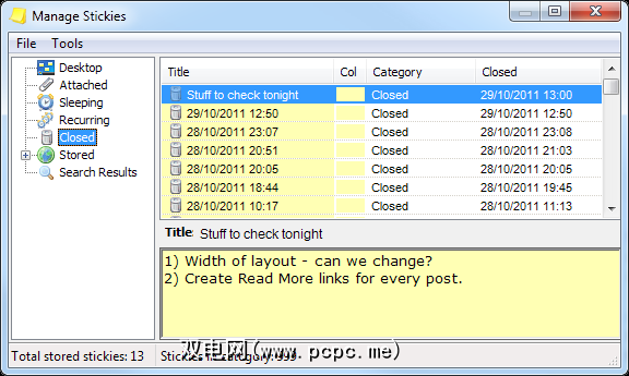 使用“真实"便签(纸制)时,您是否偶然想到您将便签从墙上拿下来扔到了纸篮中,发现自己第二天疯狂地通过垃圾桶寻找它?对于Stickies,这永远不会发生。您关闭的便笺将保留在“关闭"下的简洁管理界面中,并且默认情况下按时间顺序进行排序。如您所见,最大历史记录大小为999个便笺,即使您频繁使用Stickies也足够。您可以使用Stickies的内置搜索功能来查找任何类别的笔记: