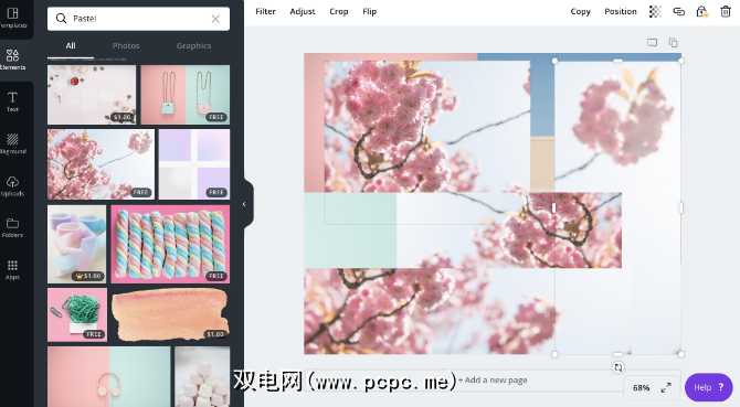 要添加过滤器或进行调整,请点击要更改的设计元素,然后从此处进行选择。 Canva让您可以从免费和付费的图片库中进行选择,也可以上传自己的图片。