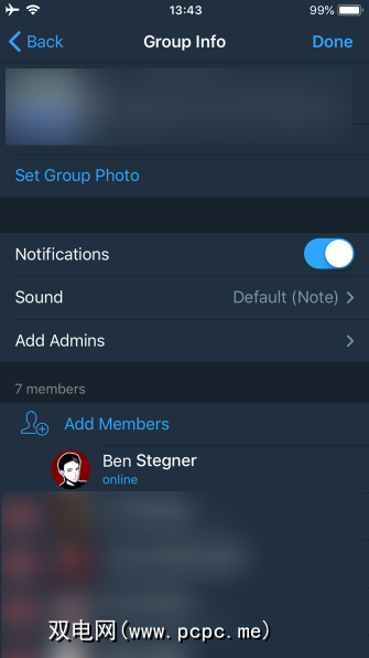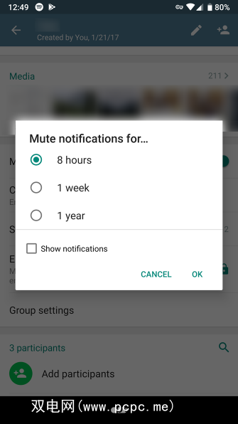 这些设置默认情况下适用于所有聊天,但您可以将其覆盖以用于一个特定的线程。打开对话,然后点击菜单>群组信息。点击自定义通知,以为此聊天自定义上面的相同控件。使用静音通知滑块可将通知静音八小时,一周或一年。