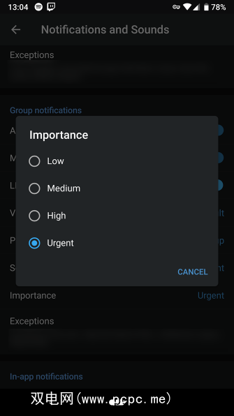 禁用消息预览,您不会看到锁定屏幕上消息的内容。使用 Importance (重要性)选择器从Android在Oreo及更高版本上的四个优先级中进行选择,我们将在下面对此进行讨论。