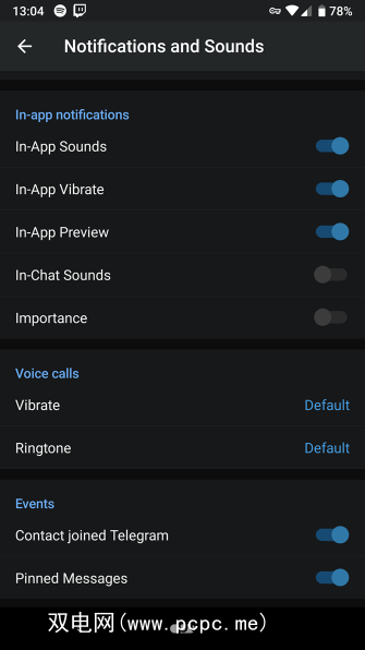 就像WhatsApp一样,您会看到这些通知被分解为消息通知个人和群组通知进行群组聊天。其中大多数与上面的WhatsApp相同。 Telegram特有的选项是消息预览和重要性。