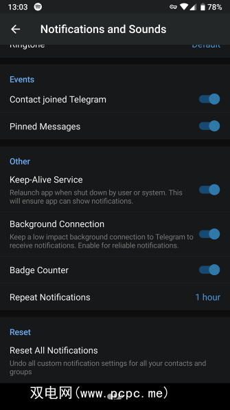 Telegram为您提供比WhatsApp更多的选择。向下滚动,您可以关闭各种应用内通知,更改语音通话的铃声,并禁用其中一位联系人加入时Telegram发送的通知。您将在底部找到重置所有通知。