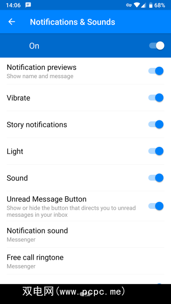 在Facebook Messenger中,点击右上角的个人资料图片,然后选择通知和声音。在这里,您会发现与上述应用类似的控件集。您可以禁用通知预览,关闭声音,灯光或振动,以及更改声音和铃声。
