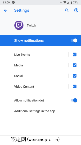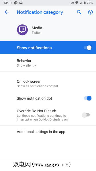 并非所有应用程序都支持此功能。如果您打开不使用通知渠道的应用程序设置(或者您使用的是Android 7 Nougat或更早版本),则唯一的选择就是简单的开/关开关。